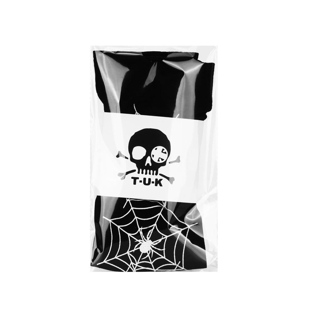 The Black Spider Thigh High Sock is comprised of 90% Polyester and 10% Spandex black mesh with a white printed spiderweb and spider pattern.