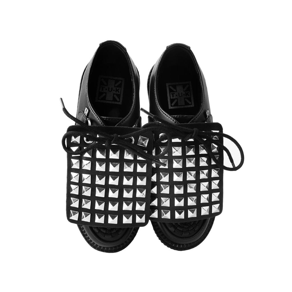 Add some versatility to your T.U.K.’s with this rad removable shoe apron featuring pyramid silver studs throughout. Easily add them onto any of your creepers and sneakers that have shoe laces to give your kicks a totally different look. Comes in a pair of two.