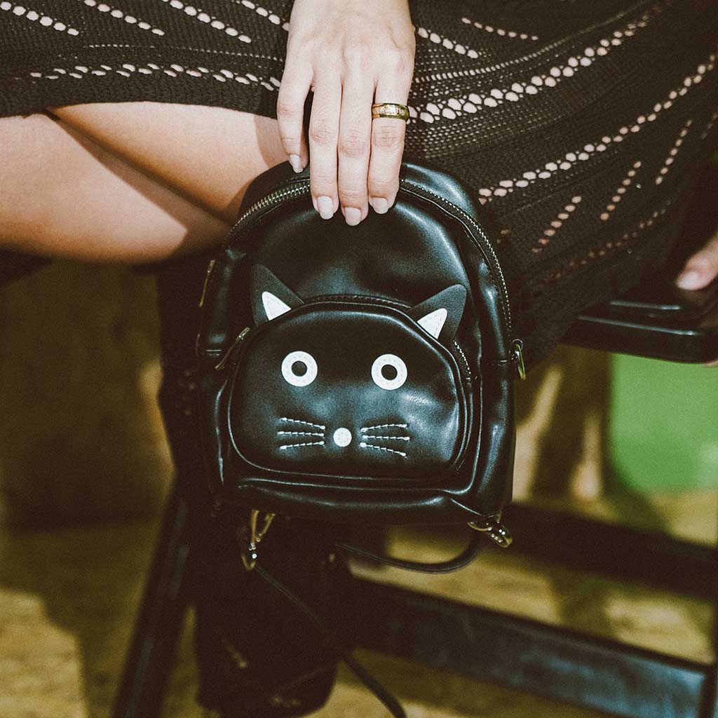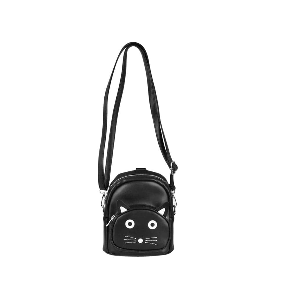 Calling all cat lovers! Your new favourite bag is here! Can be worn as a backpack, crossbody, or purse. Features adjustable and moveable straps, two zipper pockets. Made from vegan leather.