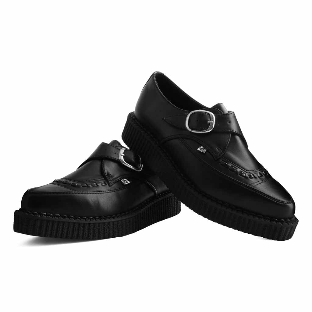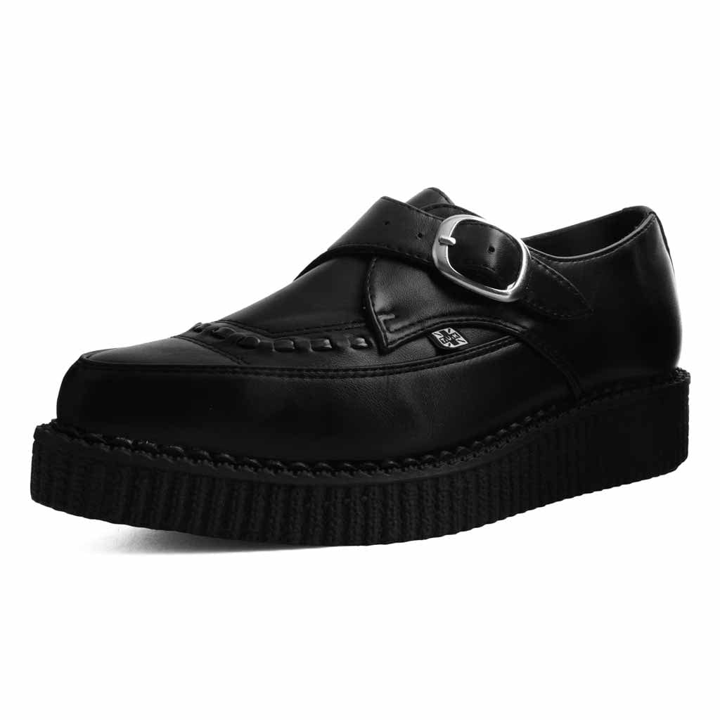 Classic pointed creeper. Premium Black TUKskin upper with matching black interlace. Low lightweight ribbed 3cm sole and monk strap with silver buckle. TUKskin™ premium vegan faux leather breathes and can be polished just like leather but is 100% vegan.