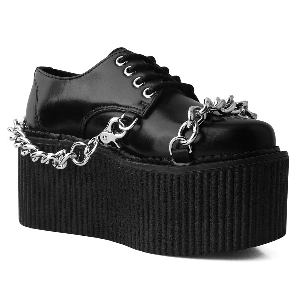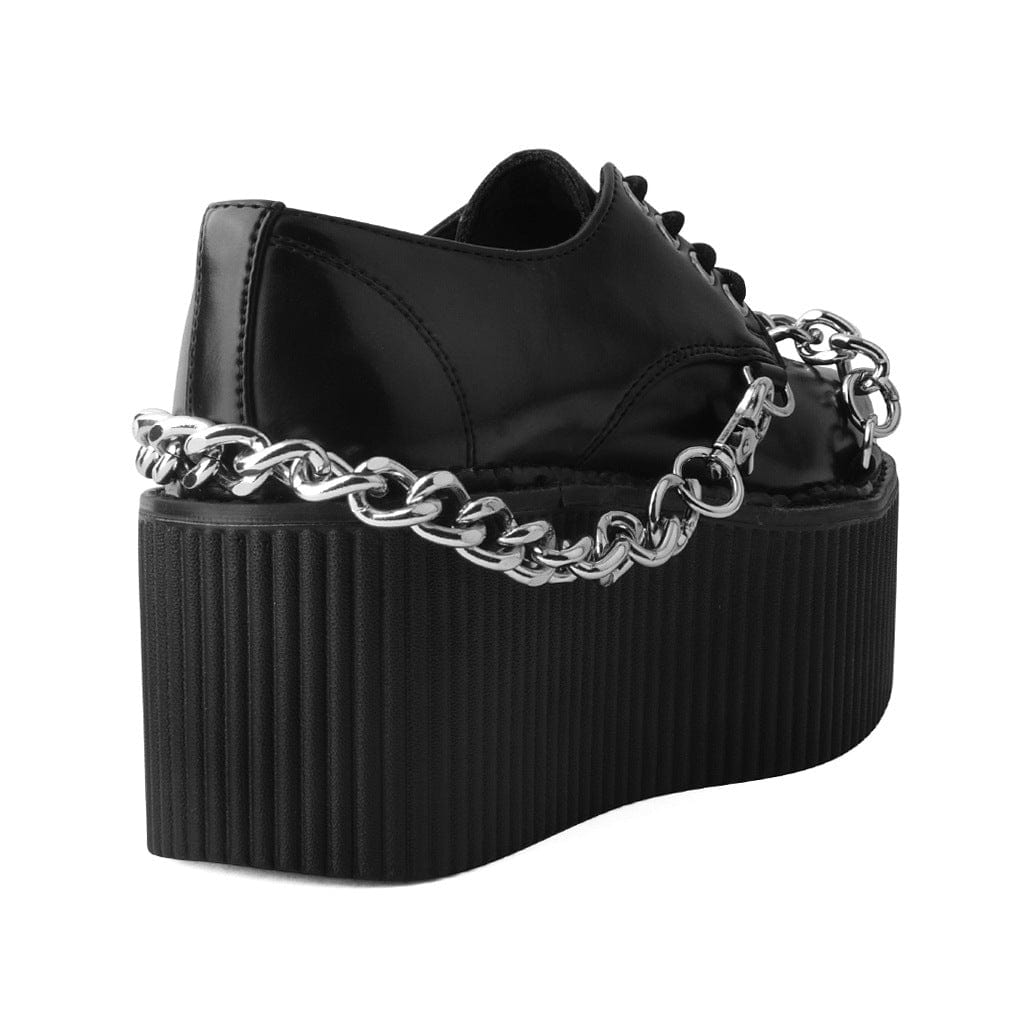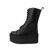 Stand tall and stand out with our StratoCreeper in black vegan leather. Featuring a lightweight 7.5cm sole with our iconic T.U.K skull & bones tread. Includes plush memory foam insoles and zipper closures for easy on & off—the perfect vegan creeper for added height with maximum comfort.