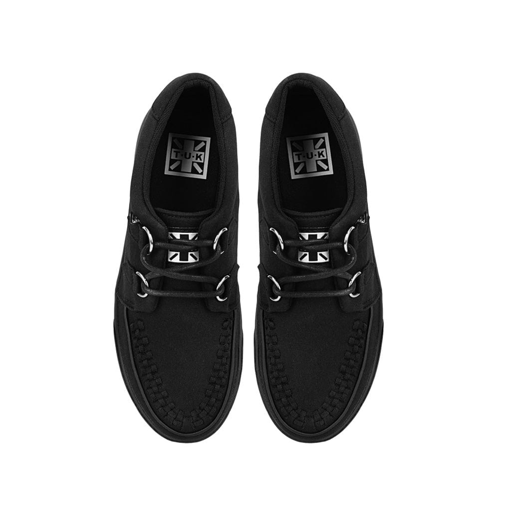 Black canvas creeper sneaker. With memory foam insole, skull & bones tread and steel D-ring laces.