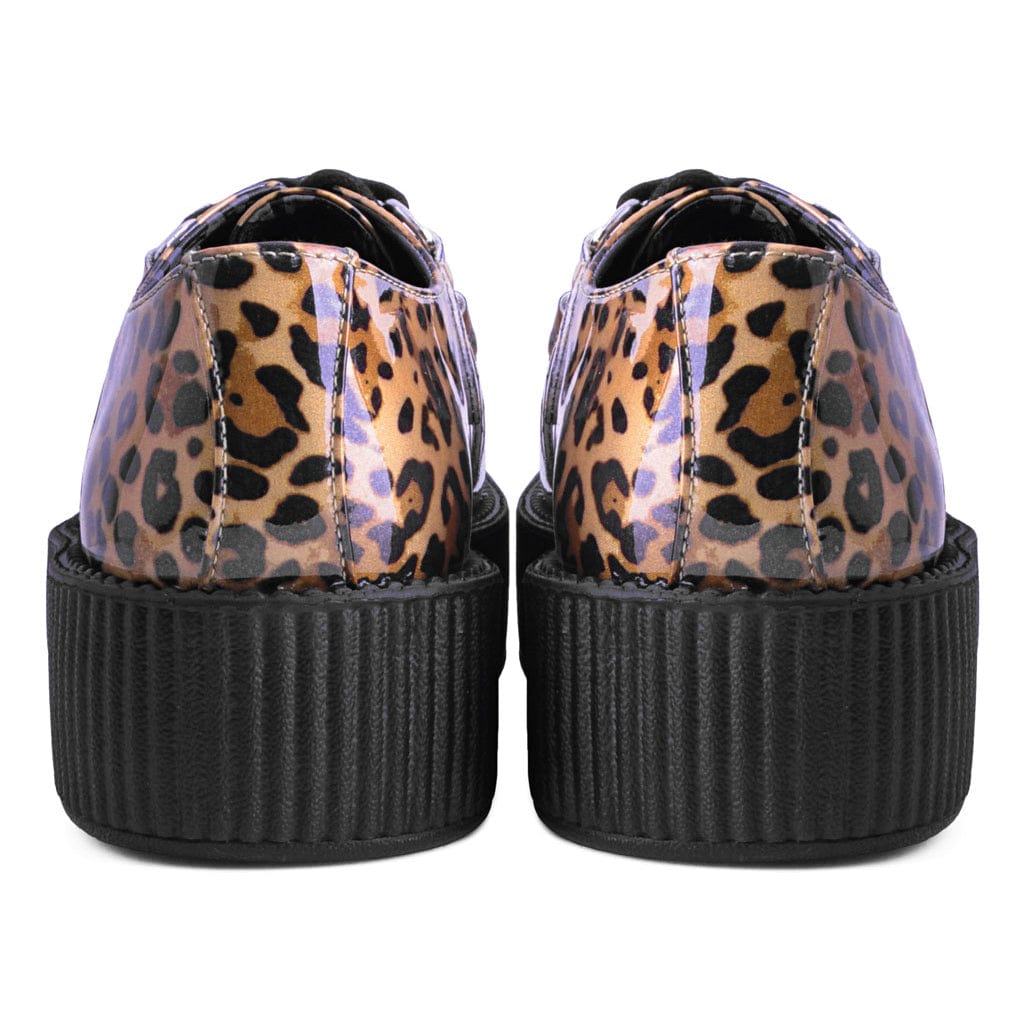 Stand out in the T.U.K viva high creeper in patent leopard. Includes D-ring laces and lightweight viva high sole for added height. Includes removable memory foam insoles for extra comfort and our iconic bones skull & bones tread sole. Vegan and Peta-approved.
