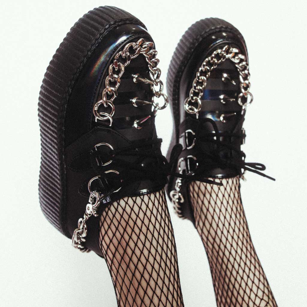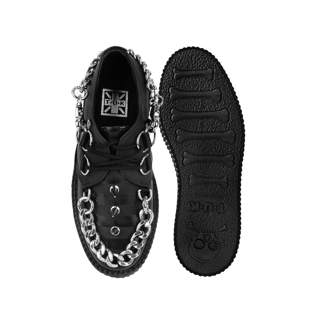 Classic round toe creeper with viva high sole. All Black TUKskin™ with metal spikes on the vamp along with chains across the toe and heel. Features T.U.K.'s unique lightweight viva high sole with skull n bones tread and 4cm height. TUKskin is a breathable vegan leather that polishes like the real thing. Accessorize with bondage straps or lace colours.