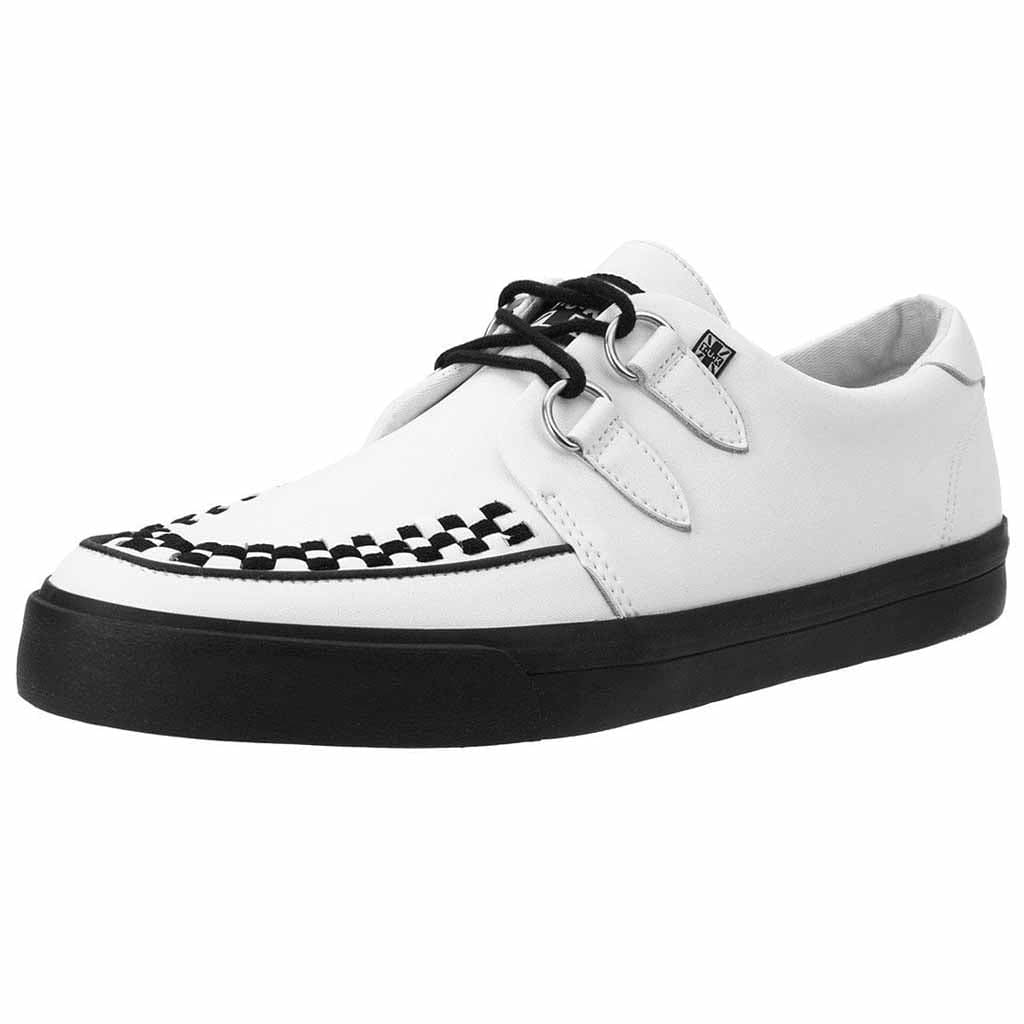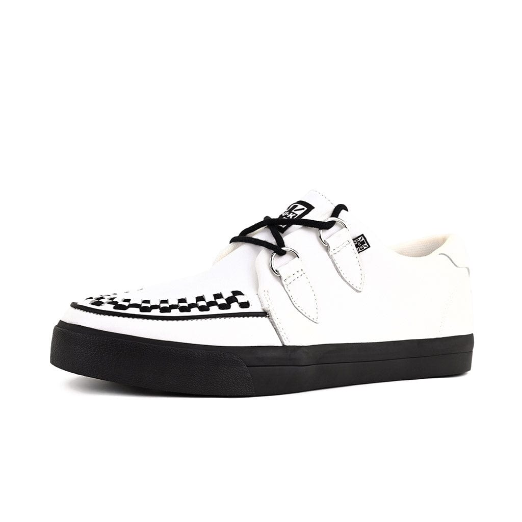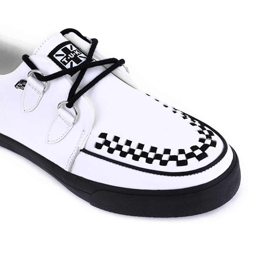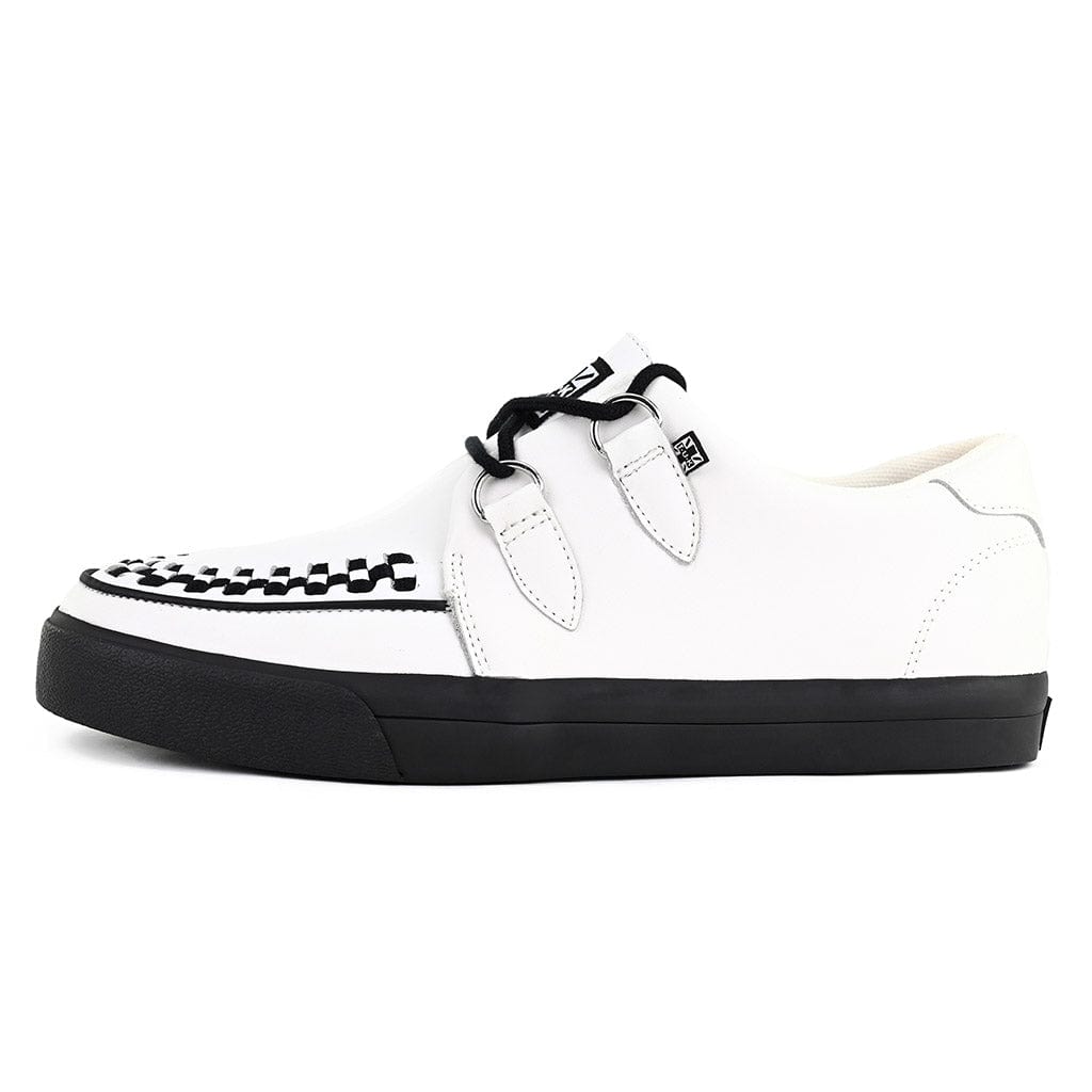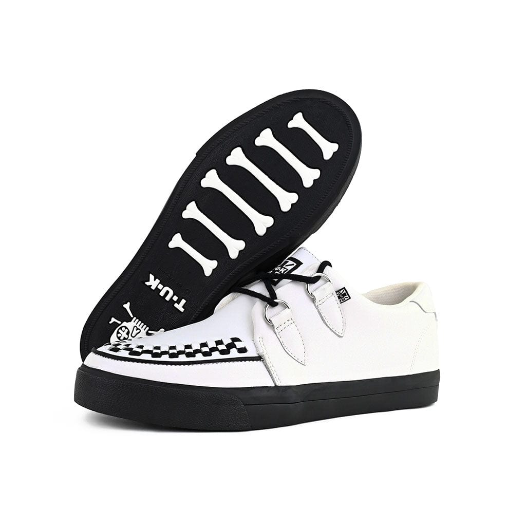 The T.U.K white leather creeper sneaker. Made with high-quality white leather and contrasting black interlace, these sneakers feature a padded tongue and memory foam insole for added comfort. Completed with steel D-rings and skull and bones sole. Wear it on its own for the perfect everyday sneaker or style with your favourite T.U.K accessories.